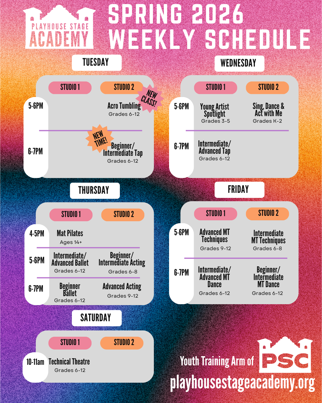 Any schedule, leveling or calendar questions? Direct them to Director of Education, AshleySimone Kirchner at ashley@playhousestage.org